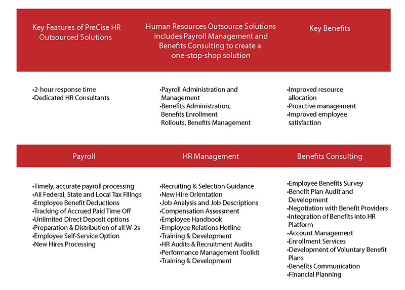 PRECISE provides Human Resources Outsourced Solutions to various organizations that have downsized their operations and outsourced the basic elements of the HR functions as described in the table below:
