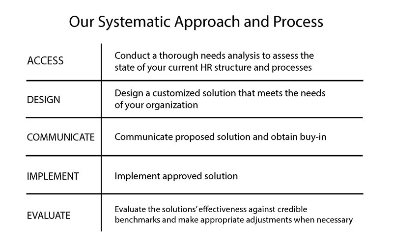 We do this by looking at your overall Human Resources strategy and we work to ensure that the Human Resources Strategy and all its components are carefully aligned.  We view each of the Human Resources functions as integral parts of a whole – each one affecting the functioning of the other and ultimately impacting your Human Resources and Corporate approach.
